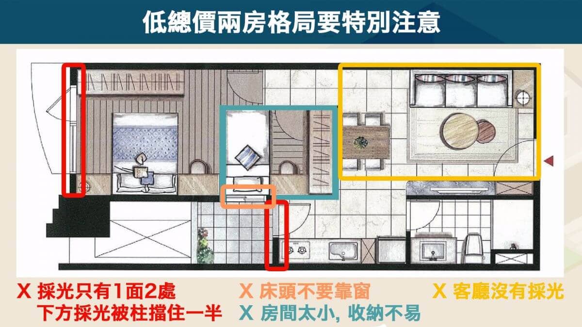 上圖是大家很常看到的低總價兩房,雖然說是兩房,但其中一間房間特別小,收納容易有問題,而且以這張傢配圖來看,小房的窗戶開在床頭容易被干擾。