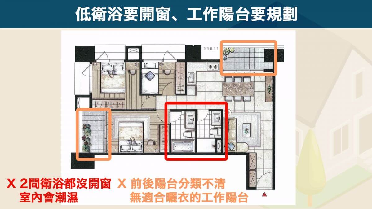 上圖雖有2間衛浴,但都沒有開窗,室內會有潮濕問題。