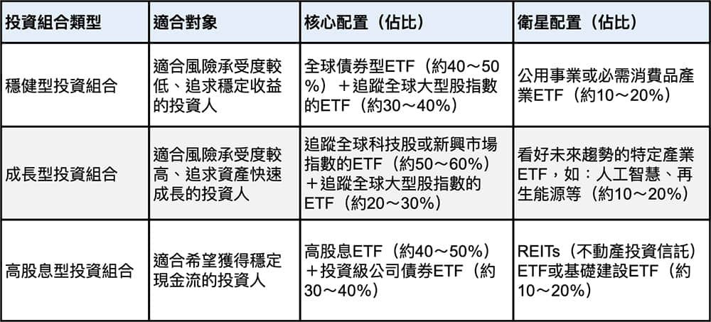 了解了ETF的基本概念和選擇原則,接下來我們一起透過表格,看看幾個常見的ETF投資組合範例,你可以按照自己的風險承受度和投資目標進行調整。但要記得「沒有一種組合適合所有人」,最重要的是找到符合你個人需求的配置。