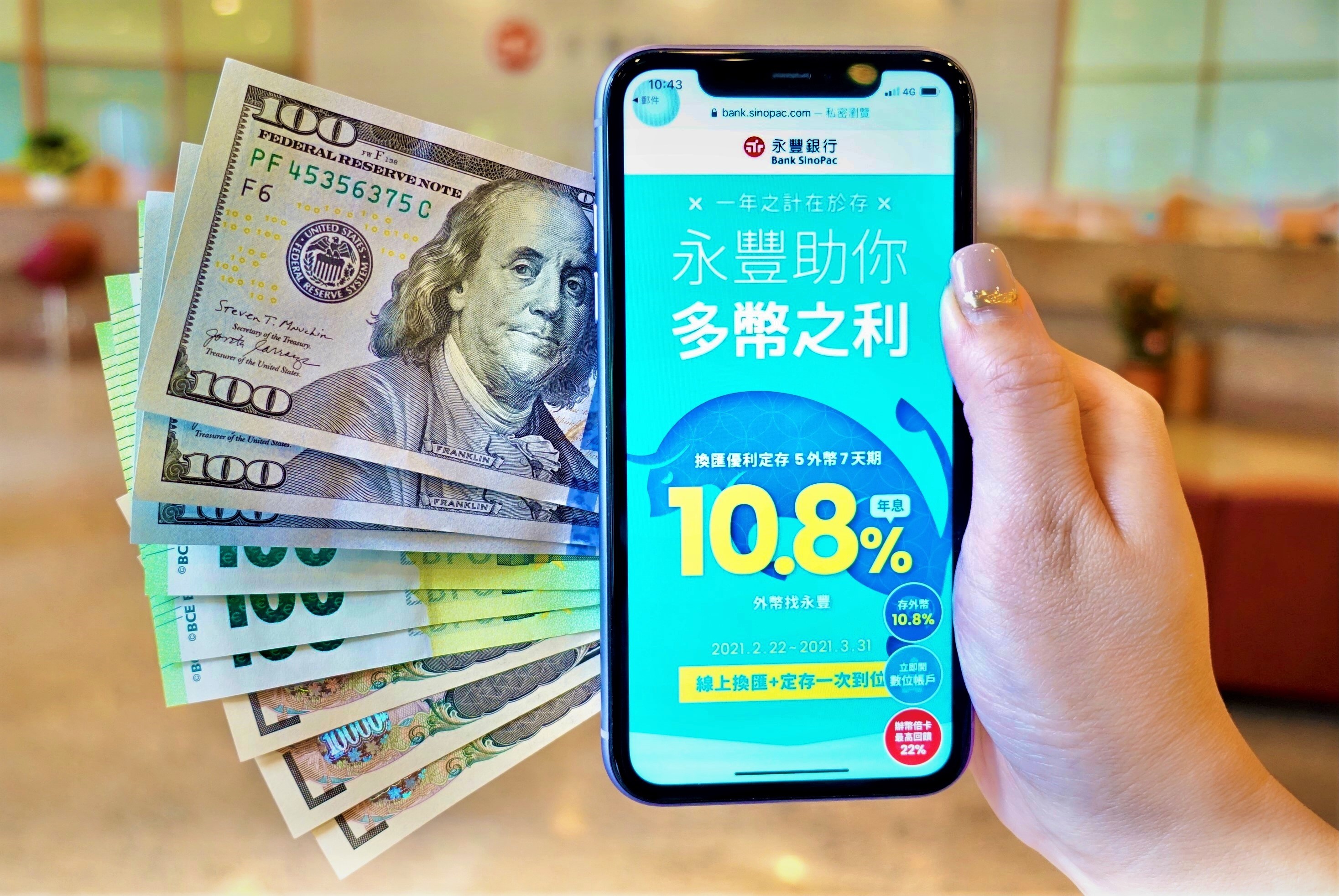 圖說:永豐銀行推出「換匯優利定存」享外幣10.8%年息(7天期)定存優惠,線上換匯加外幣定存一次到位,讓民眾輕鬆理財。