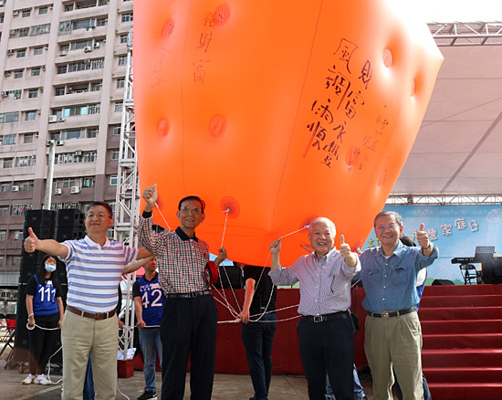 永豐銀行舉辦「2017永豐家庭日兜風趣」邀員工親子同樂,並由集團大家長、永豐金控董事長何壽川(右2)率主管象徵性釋放天燈,祝福新的一年「風調雨順、財富永豐」。圖左1永豐銀行代總經理魏哲弘、左2永豐金控最高顧問邱正雄、右為永豐金控總經理游國治。