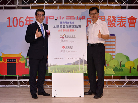 (2017.9.22,台北訊)全力推動閒置用地綠能發電計畫,永豐銀行、台南市政府今(22)日簽署合作意向書,共同打造低碳城市。永豐銀行指出,針對設籍或廠區位於台南市的個人及企業,提供太陽能設備專案融資貸款,降低建置期自備款,加快乾淨能源普及速度,永續台灣環境。