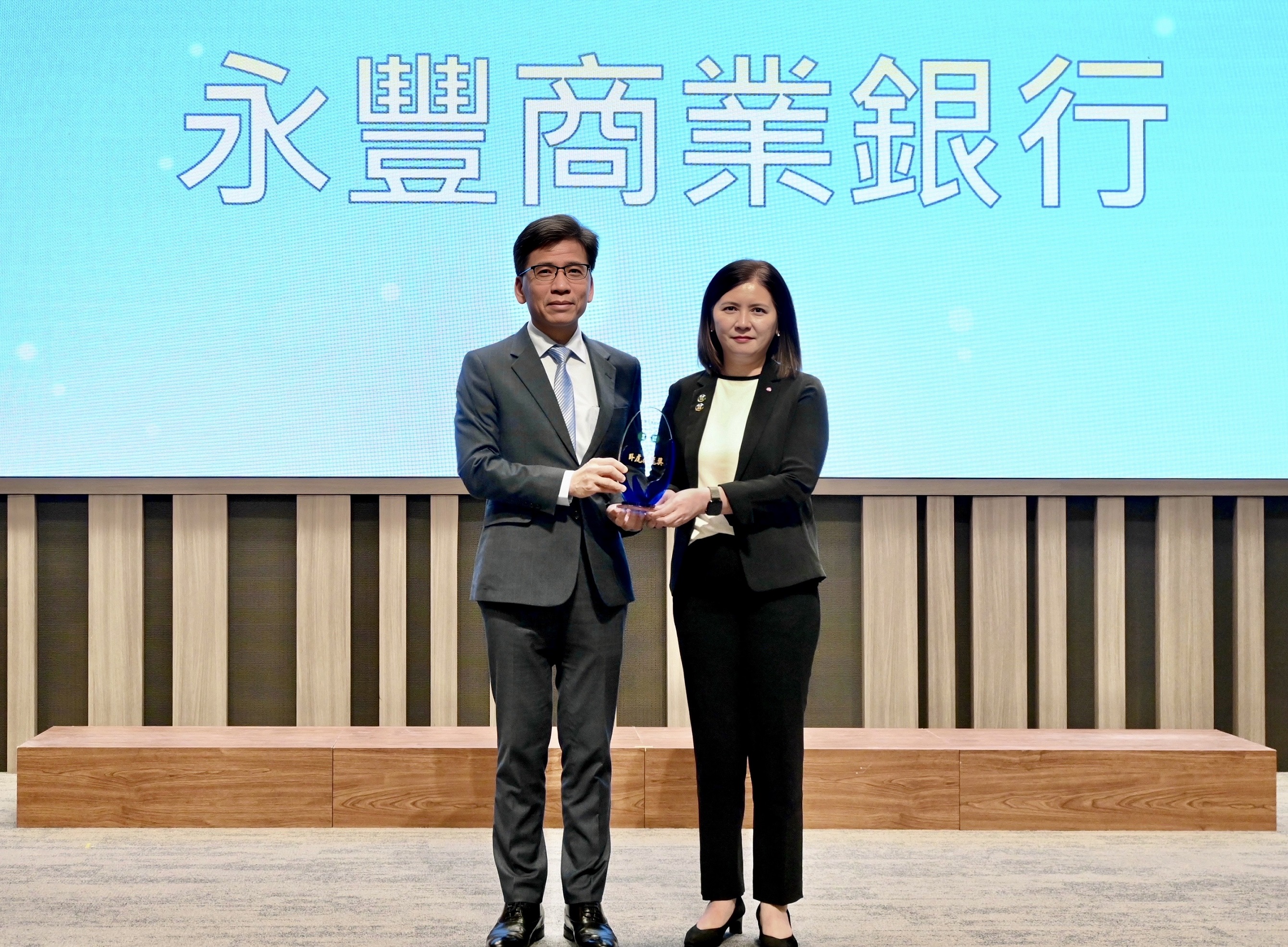 圖說:永豐銀行於高齡金融規劃、信託宣導與集管帳戶服務等表現卓越,今(30)日榮獲信託公會三項大獎肯定;由金管會主委彭金隆(左)頒獎予永豐銀行信託處資深協理林麗眞(右)。