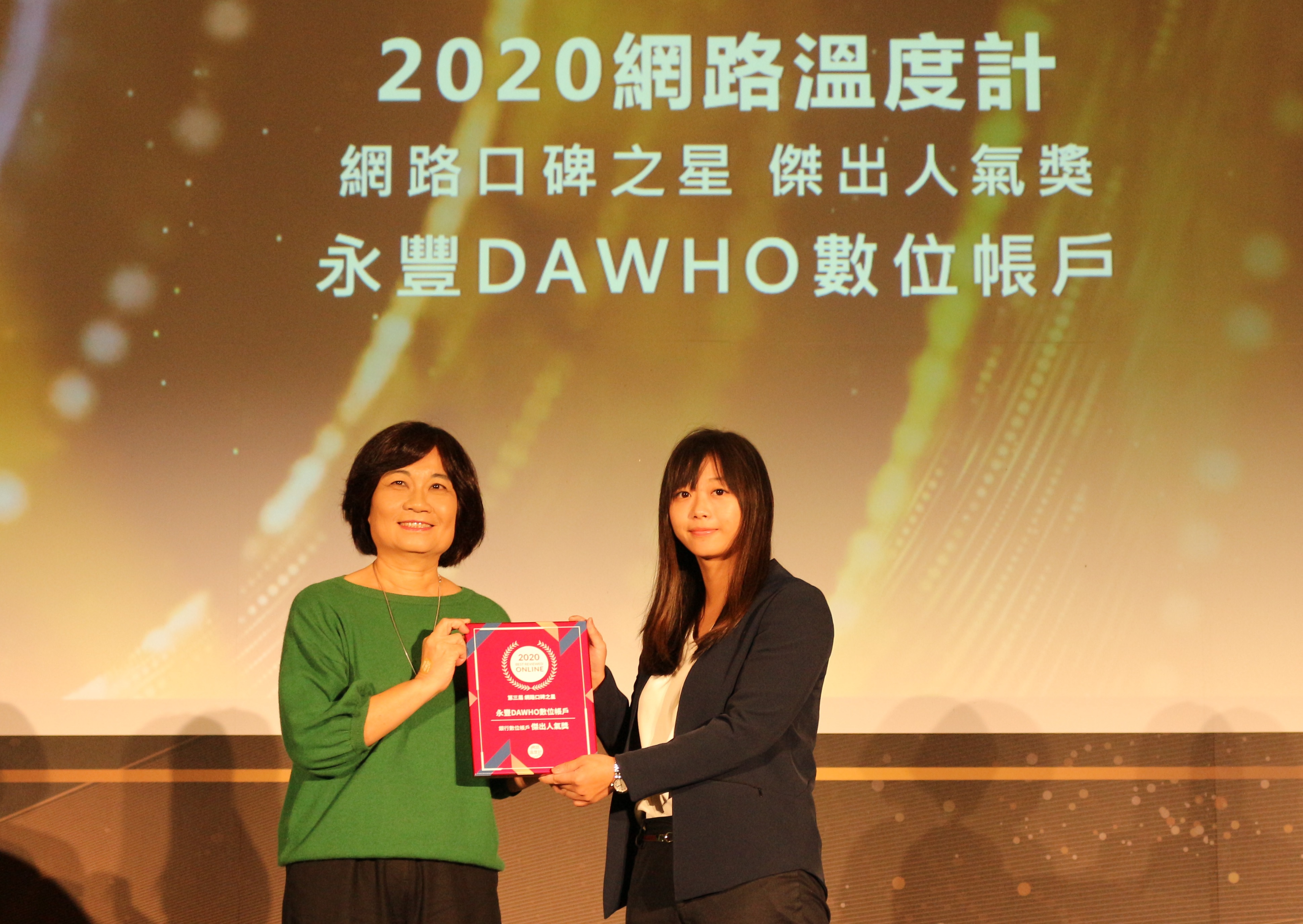 照片圖說:永豐銀行數位帳戶「大戶DAWHO」今(24)日獲網路溫度計DAILYVIEW頒發「2020網路口碑之星-傑出人氣獎」,由前國家發展委員會主任委員陳美伶(左)頒獎、永豐銀行數位金融處數位帳戶科主管謝欣穎(右)代表領獎。