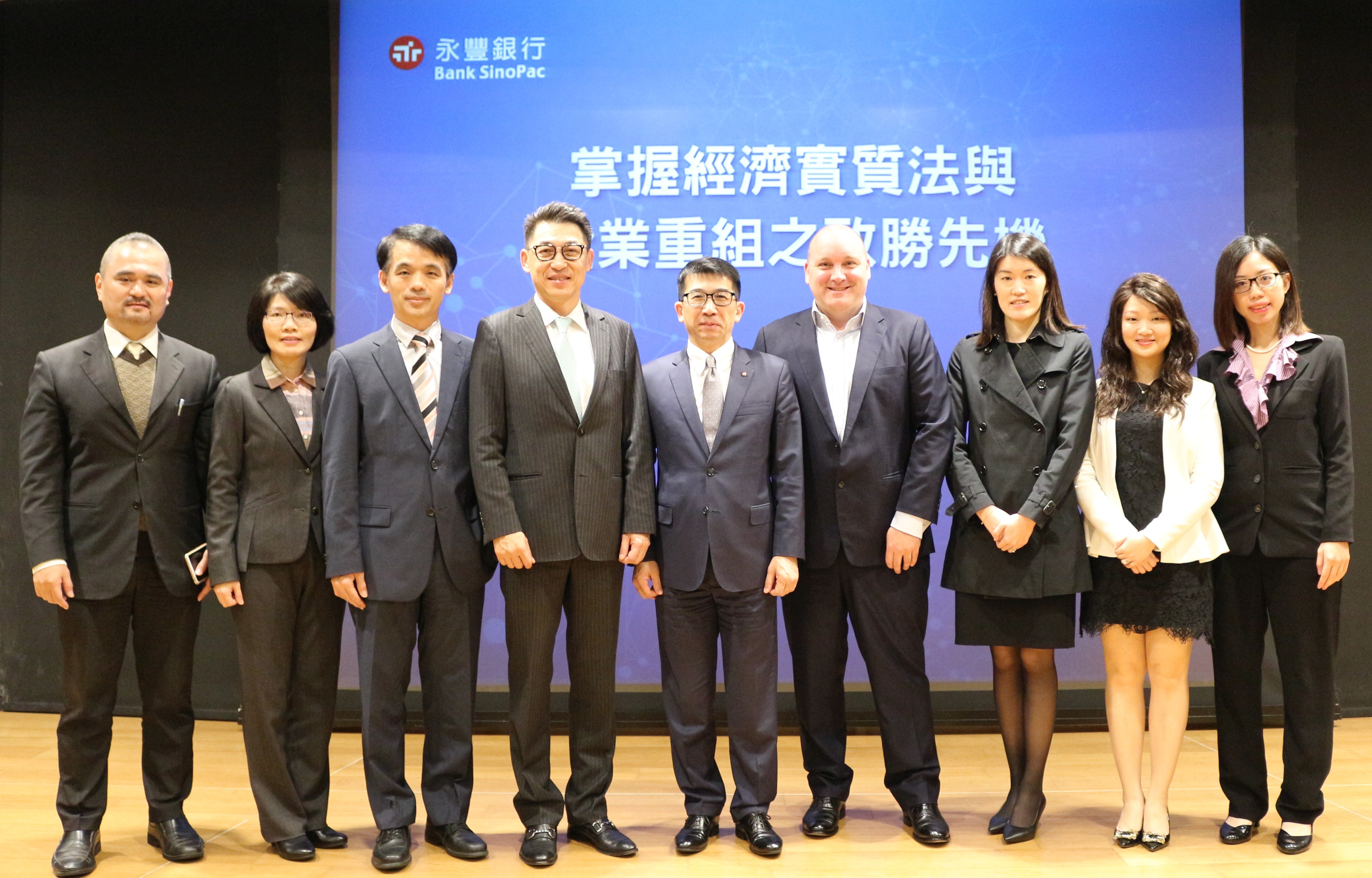 圖說:迎接後開曼時代,永豐銀行攜手國際通商法律事務所、奧杰律師事務開曼與英屬維京群島註冊律師群,共同解析經濟實質新法,培訓跨境金融菁英百人團隊,助企業導入營運新思維。永豐銀行資深副總經理歐陽子能(圖中)、國際通商法律事務所資深執行顧問王悅賢(左四)、奧杰律師事務所香港辦事處公司融資團隊合夥人Nathan Powell(右四)。