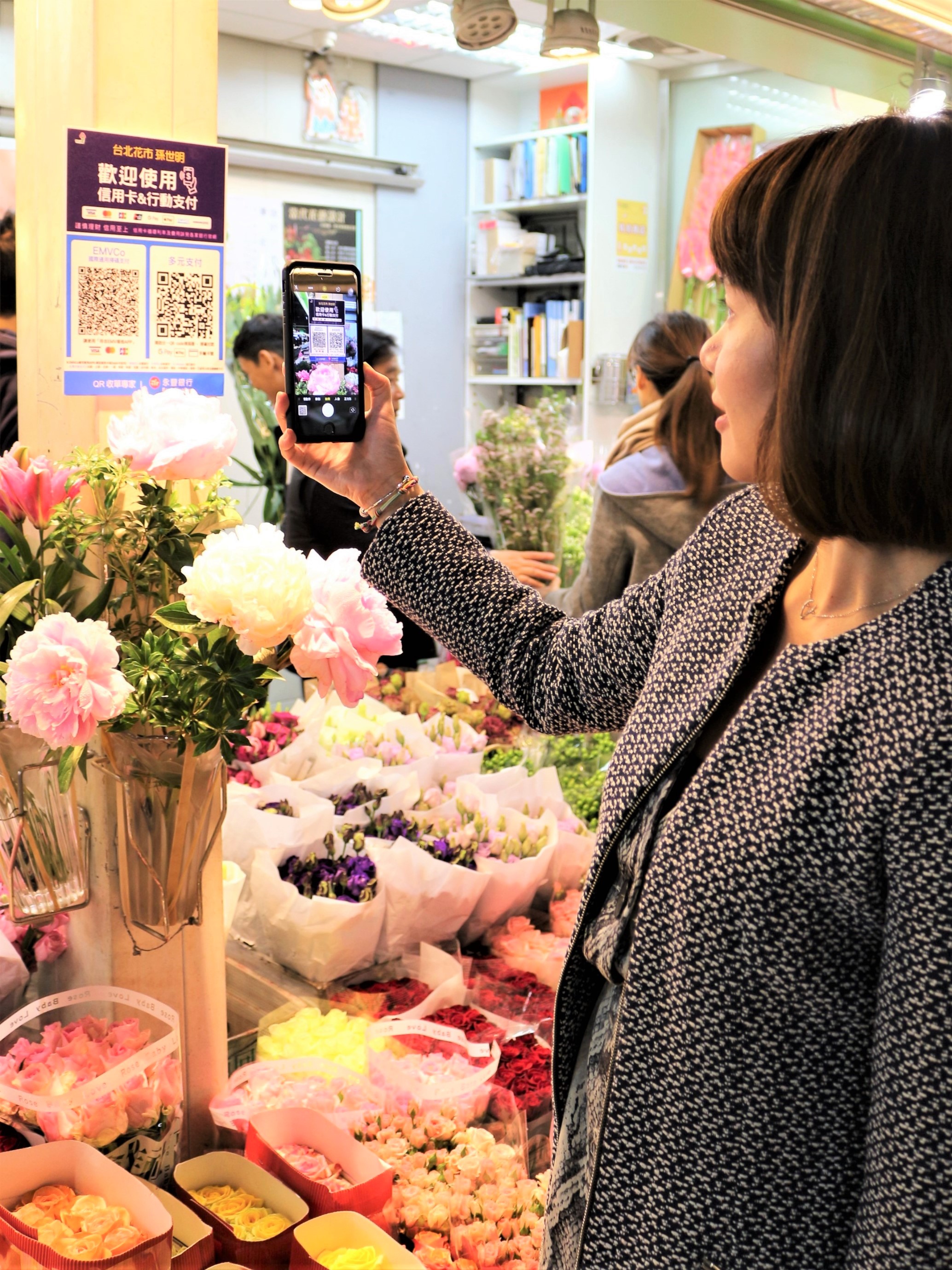 圖說三:永豐QR Pay掃碼支付與大臺北地區多處公有零售市場及農、漁、花、肉品與果菜等各類產銷批發市場合作,讓消費者免帶現金輕鬆逛市場。(背景為臺北花市)