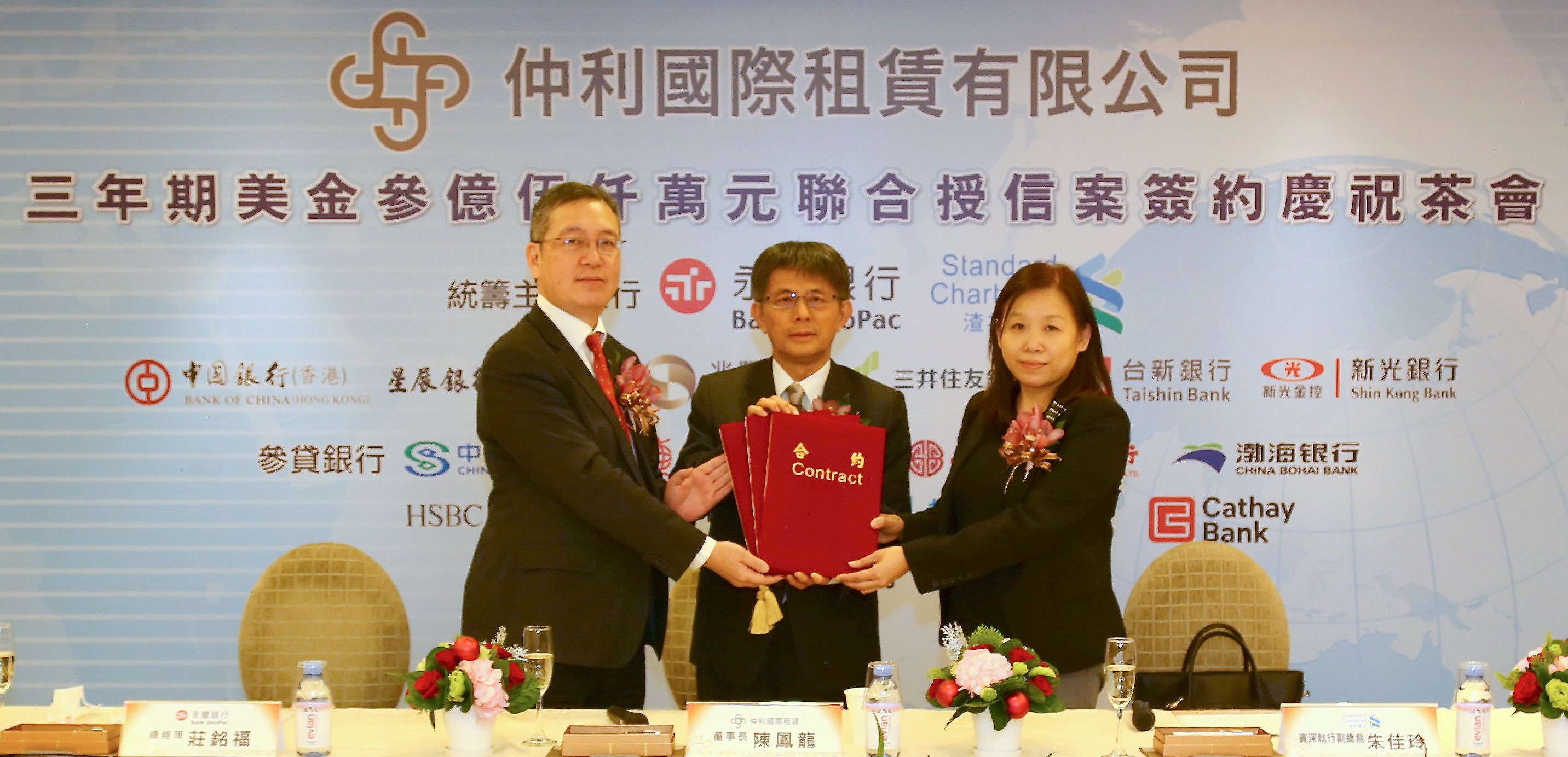照片圖說:永豐銀行統籌主辦中租控股(中租-KY)旗下仲利國際租賃3年期3.5億美金聯貸案。圖左至右分別為永豐銀行總經理莊銘福、仲利國際董事長陳鳳龍、渣打銀行資深執行副總裁朱佳玲。