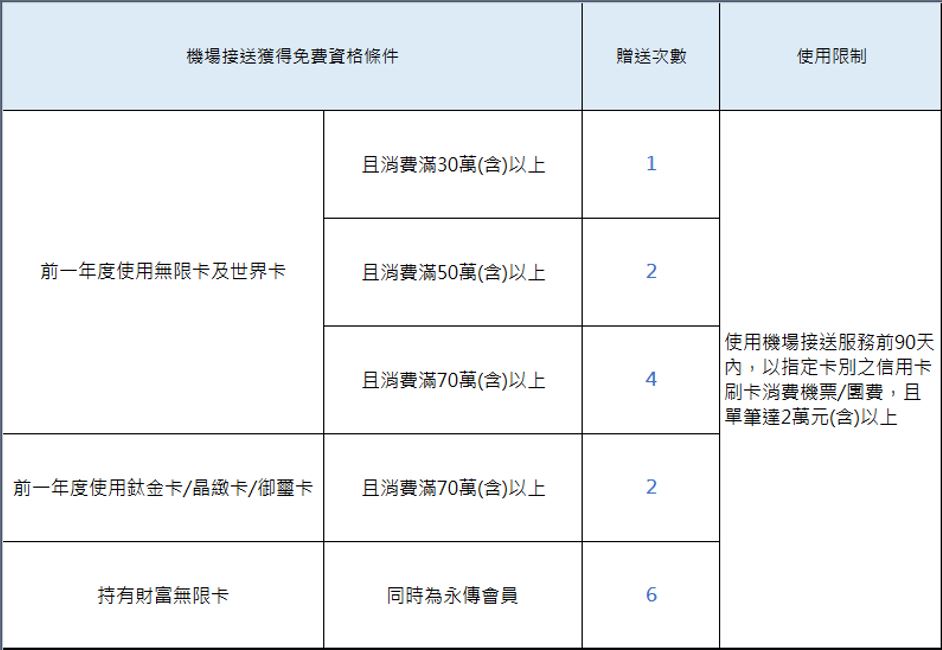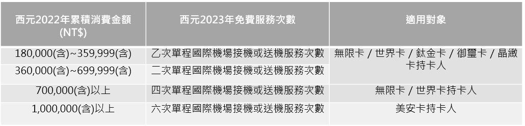 • 需使用指定卡別且符合資格條件及使用限制,得依下表享有本服務國際機場接機或送機之單程服務次數