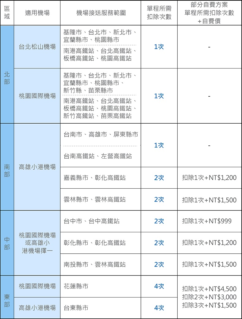 限臺灣本島內,依下表「接送服務範圍」接送至「適用機場」,非下表「接送服務範圍」者,持卡人須自行前往可接送區域再使用本服務。