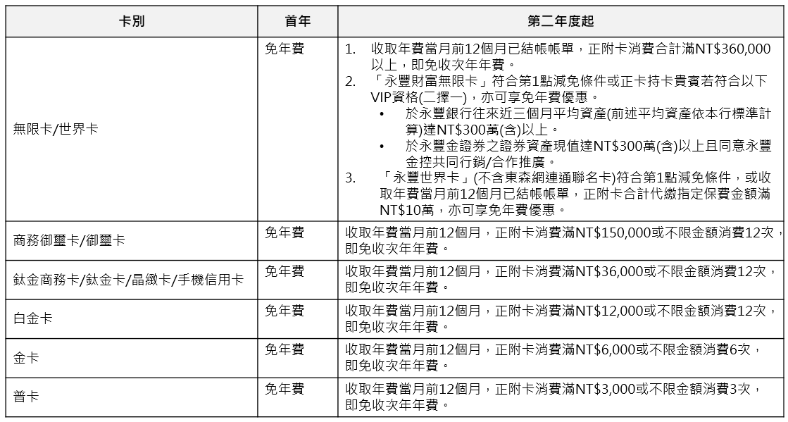 - 首年:免年費,附卡6張以內免年費。(永傳世界卡/永富世界卡除外)