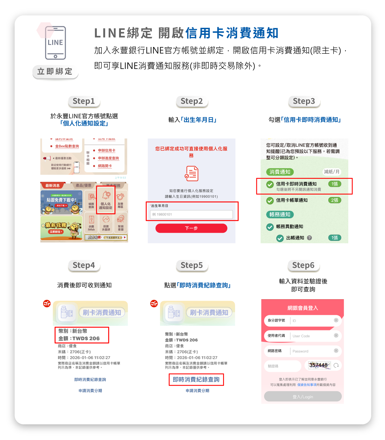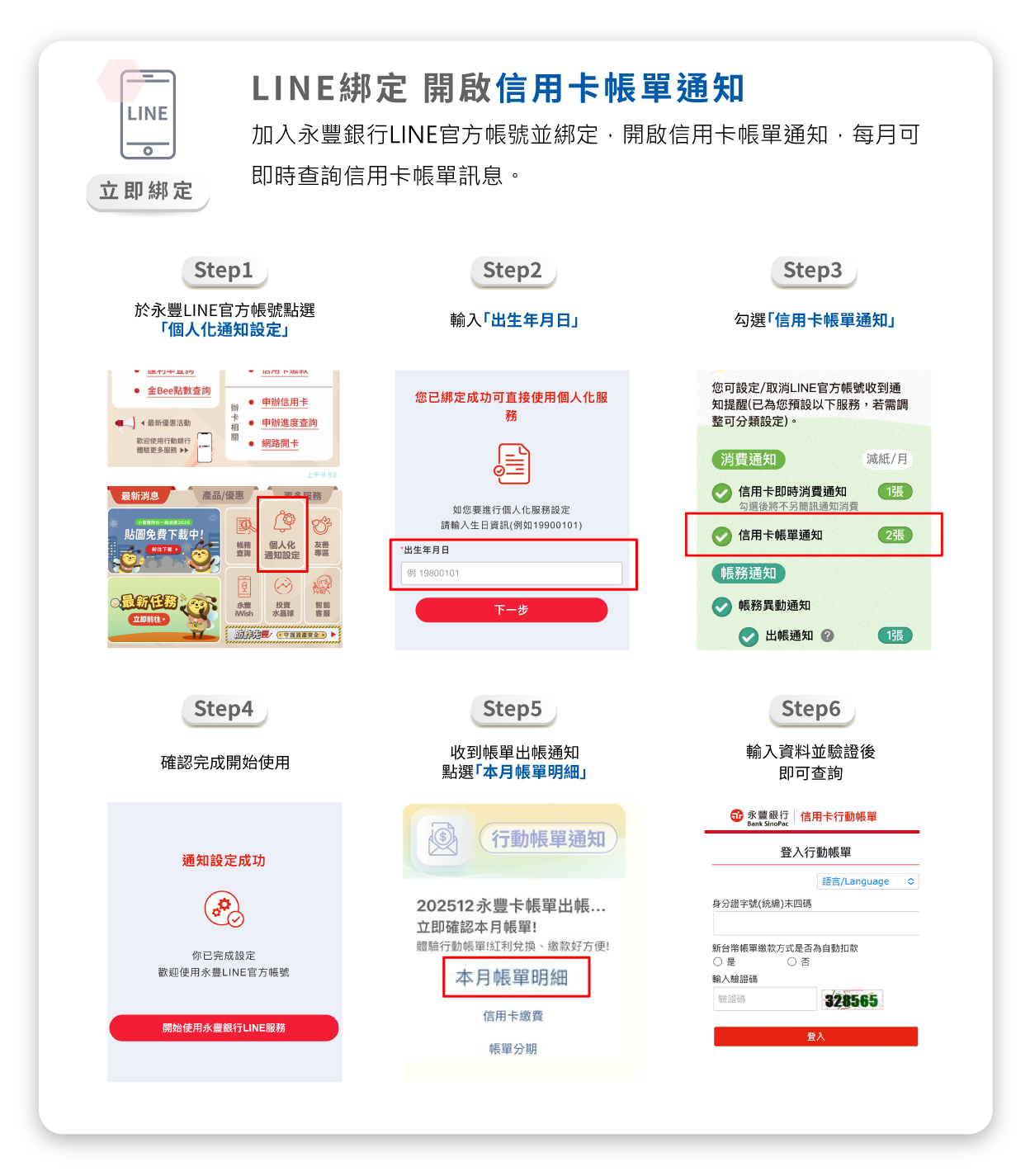 申請電子/行動帳單,加入LINE官方帳號開啟通知,帳單與消費訊息方便查。