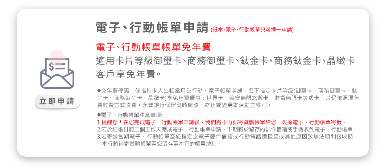 *若於結帳日前二個工作天完成電子/行動帳單申請,下期將於留存的郵件信箱或手機收到電子/行動帳單。