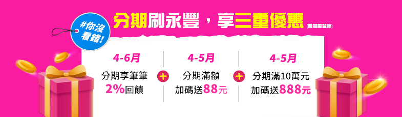 活動內容:持永豐信用卡於精選通路之特店消費分期滿額,享回饋