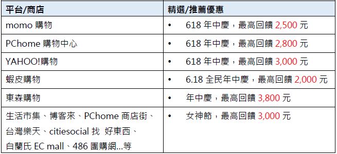 - 活動期間每卡戶限擇優回饋乙次,惟回饋對象為有效之正卡持卡人。贈送之刷卡金將於活動結束後次次月起陸續回饋。本活動贈送之「刷卡金」僅限折抵信用卡消費款,恕不得要求轉讓、提領或兌現。
