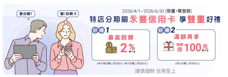 - 活動內容:刷永豐信用卡,於通路辦理特店分期消費並完成登錄,享雙重好禮!