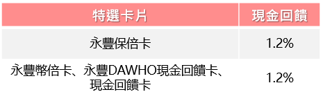 四、活動內容:以永豐特選卡片代繳適用壽險公司之保費且成功扣款者,回饋率如下表