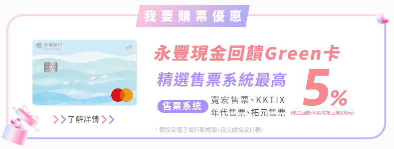 *特選售票系統回饋不限演唱會消費。 - 正附卡合併計算消費金額與回饋資格,惟回饋對象為有效之正卡持卡人。本活動之消費金額與刷卡金回饋皆以新臺幣計算;回饋之刷卡金將於活動結束後次次月起陸續回饋,贈送之「刷卡金」金額,以元以下四捨五入計算,僅限折抵信用卡消費款,恕不得要求轉讓、提領或兌現。