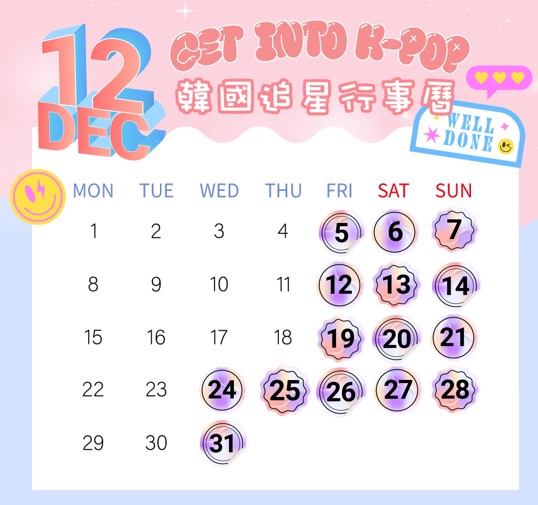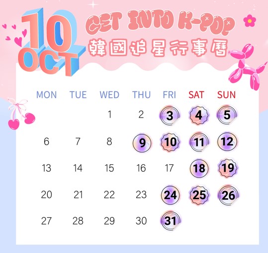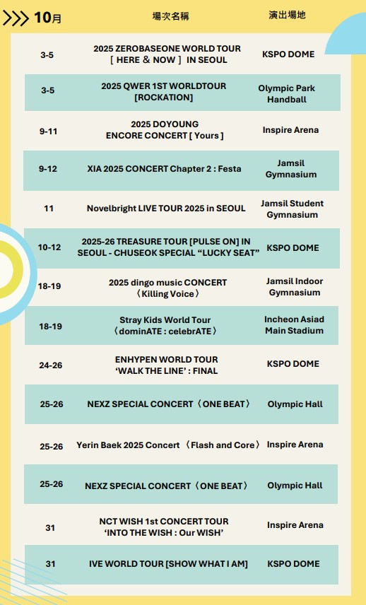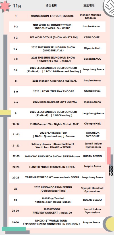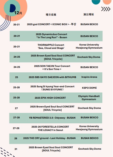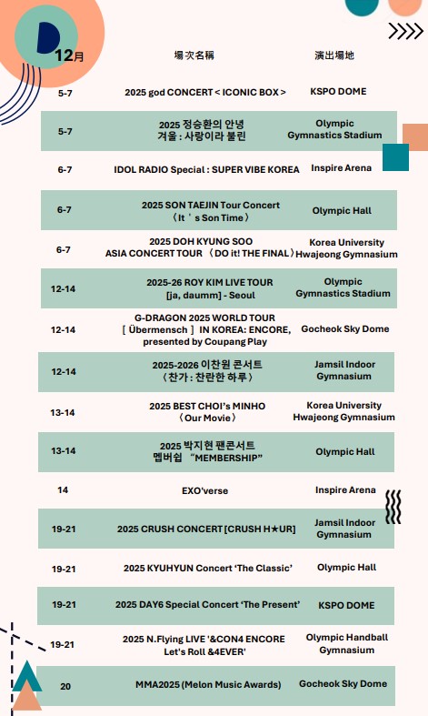 - 於韓國追星行事曆標示日期之演唱會資訊如下: