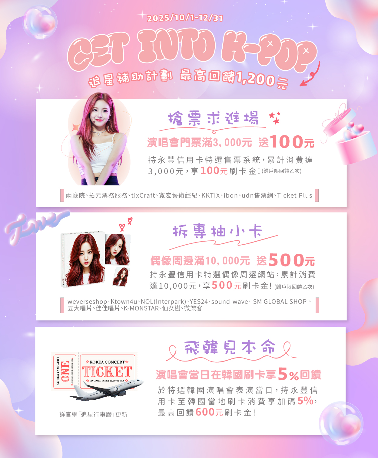 演唱會/偶像周邊/追星到韓國,永豐最高補助1,200元!
