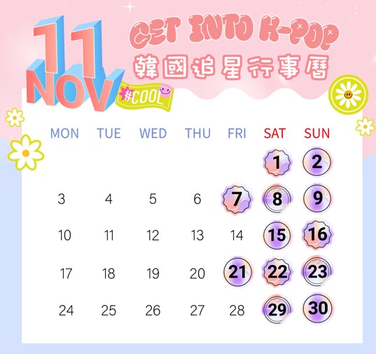 韓國演唱會行事曆如下圖標示,貼紙標示日期即享韓國當地消費加碼(需登錄),特選演唱會定義如注意事項說明,此行事曆將依指定售票平台公告持續更新。