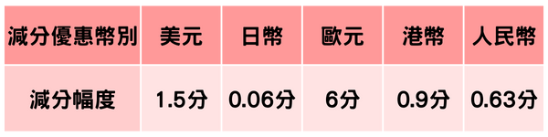 - 換匯減分專案適用範圍:買賣外幣/轉帳、匯出匯款、預約外幣現鈔。