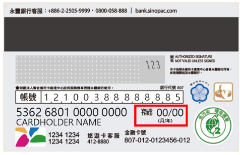 (一)卡片效期依卡片上印製的「有效期限(MM/YY)」為準,有效至該月最後一日止。卡片效期,請參閱下圖紅框標註處。