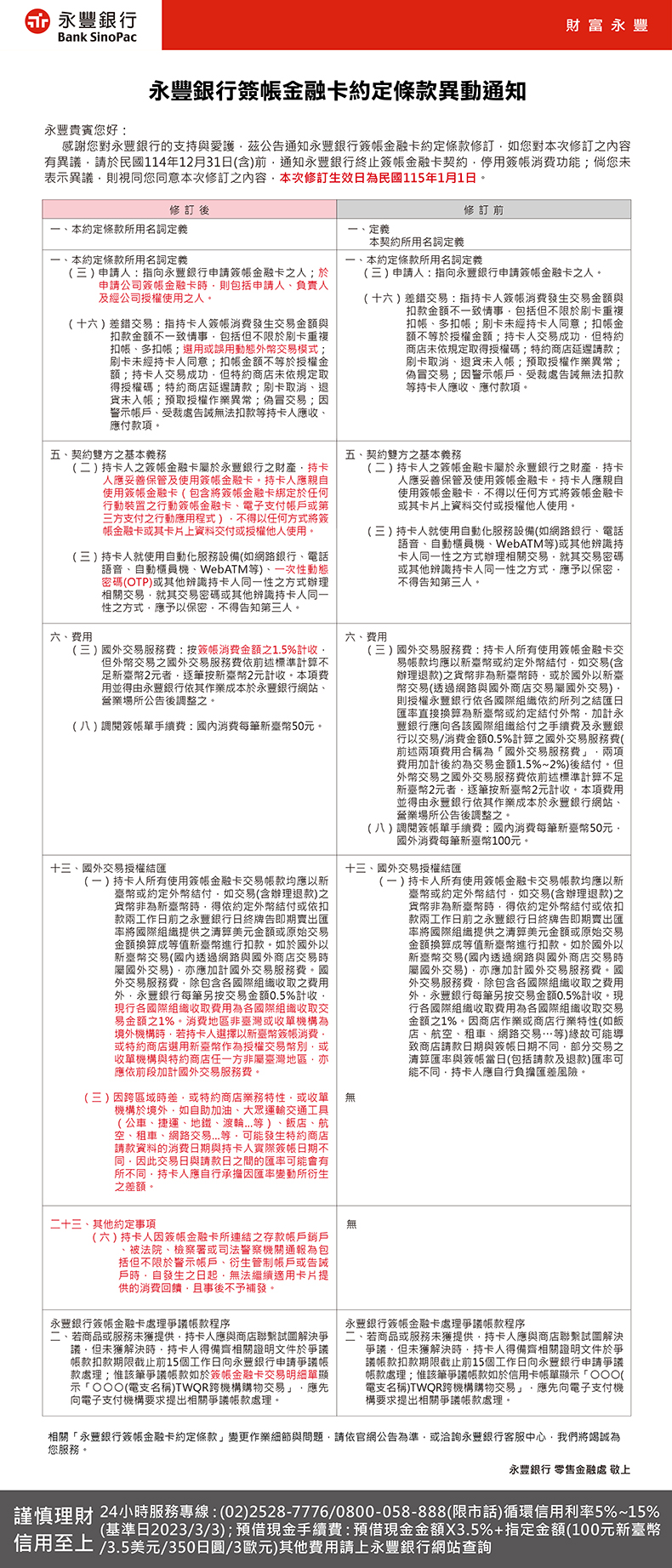 永豐銀行【簽帳金融卡特別約定條款】異動公告