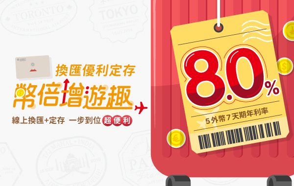 5外幣7天期8.0%年利率、5外幣1個月期最高4.5%年利率換匯優利定存